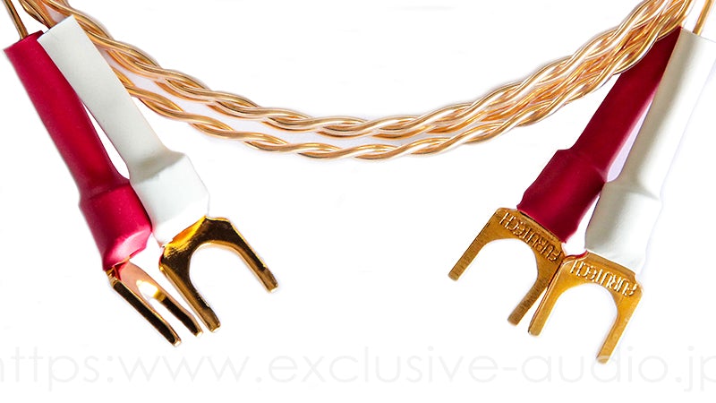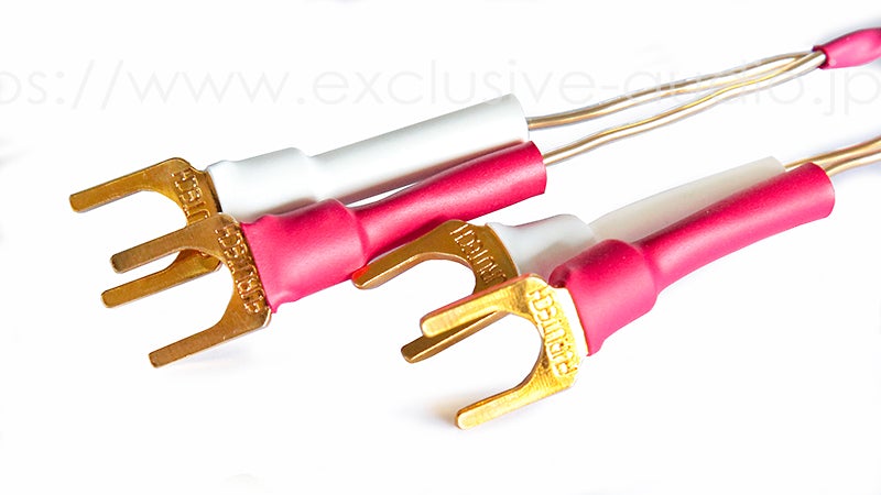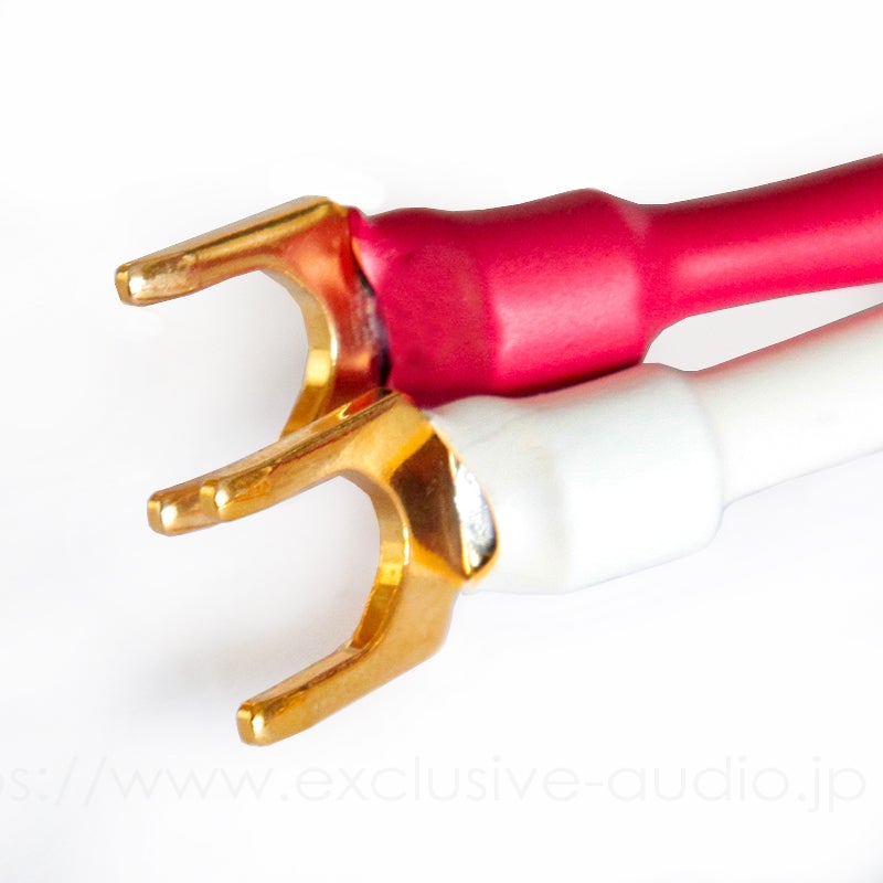 材質は音質に優れた金メッキOFC(無酸素銅)単寄線を使用し高耐圧.高耐熱のフッ素樹脂PFAを被覆に採用しております。(定格電圧600V最高使用温度250゜C連続) フッ素樹脂PFAは低誘電率2.1以下/60Hzです。スピーカー端子にはフルテック製の24K蒸着の極厚の最高級のYラグを採用する事で確実な接続と最高の状態で信号を伝えます。