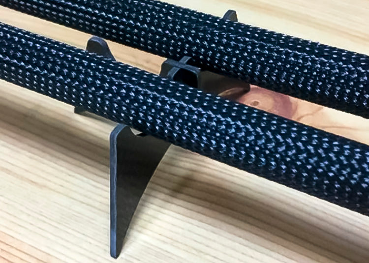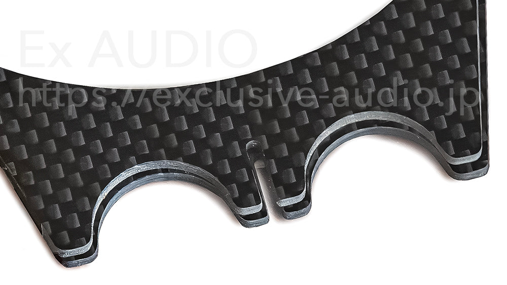 平置きする簡易構造のケーブルインシュレーターと比較するとスパイク構造は振動面で絶対的に有利であり、CFRP複合による高い制振能力と高強度な素材としての優秀さも抜きん出てます。ハイエンドオーディオケーブルで散見される直径20mmクラスの極太ケーブルにも対応しています。