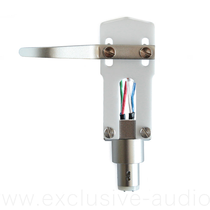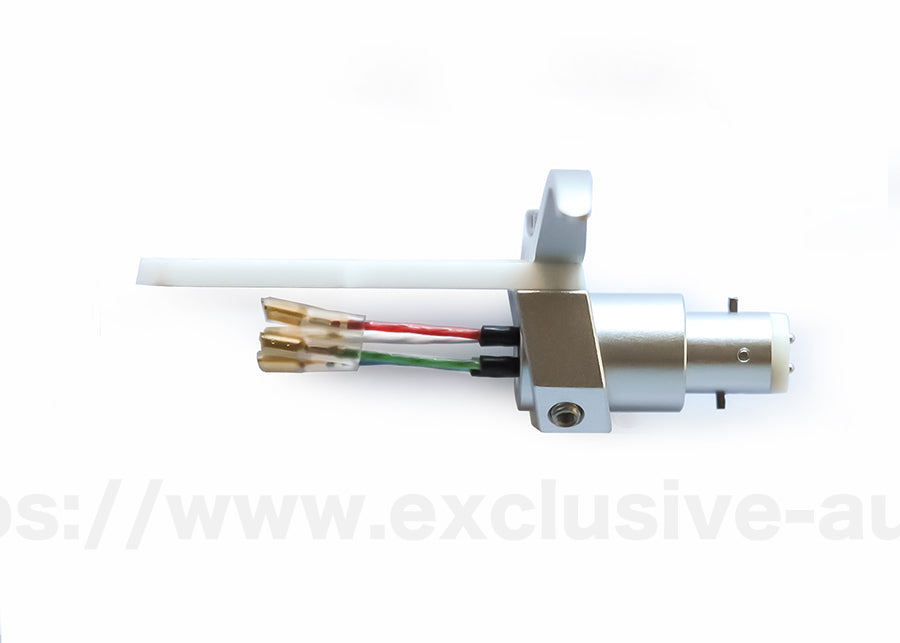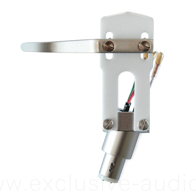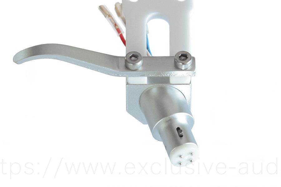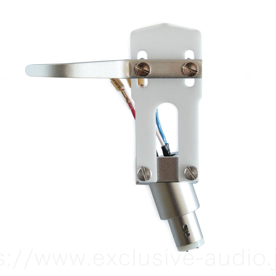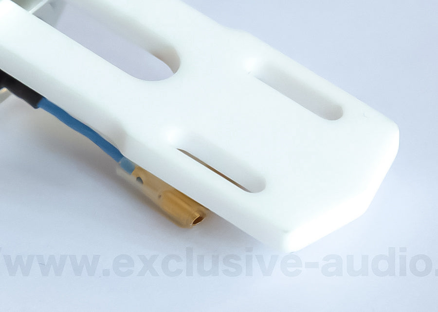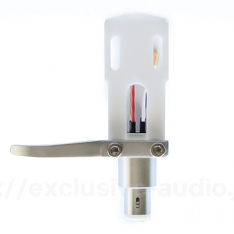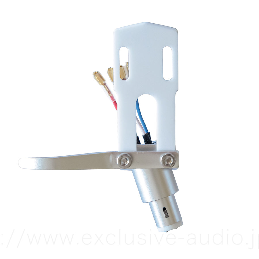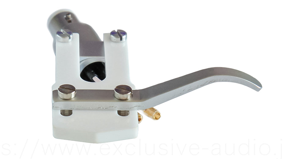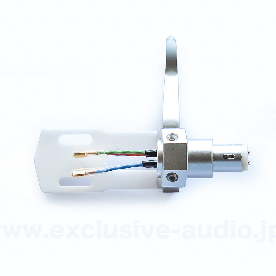セラミック材はアルミナなのでルビーやサファイアの親戚に当たります。 セラミックといえども水平部分を長くすると共振を起こし易いので必要最小限の形状にしています。これはFRやIKEDAの創立者である池田勇氏から直接に教えと設計者の経験に基づいています。指かけは厚みを2.5mmをとり共振対策をしています。リード線はPCOCCをアニール処理したPCOCCAです。アームとの接点は耐久性に優れたロジウムメッキで、ヘッドシェルの角度は調整可能になっています。