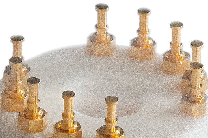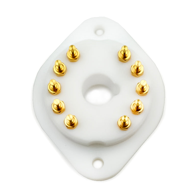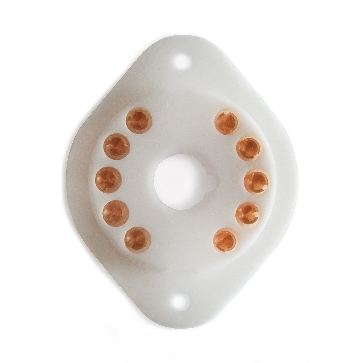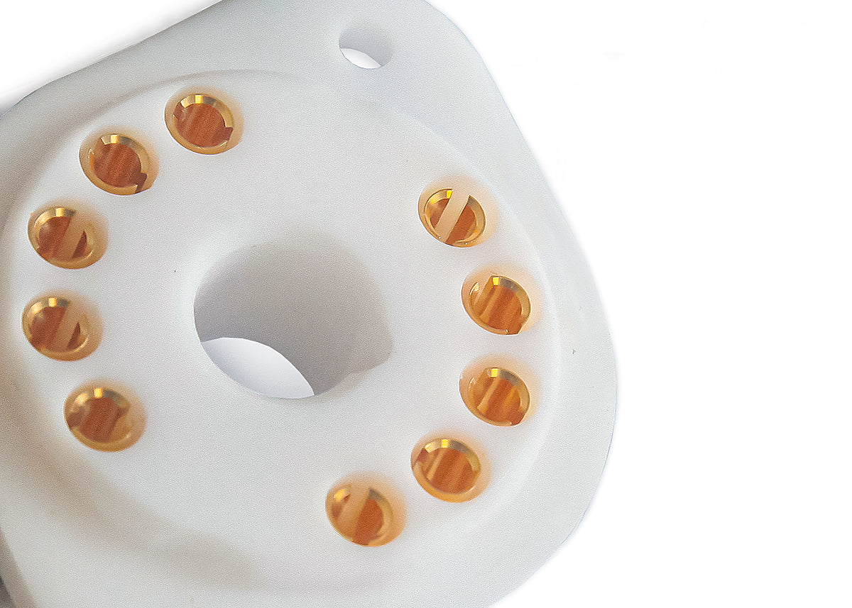 オリジナルチューブソケットはフッ素樹脂(又はコムプライト)を削りだし、丸形の切削加工によるピンを固定して構成しています。このためガタがなく真空管がしっかりホールドされるため振動による音質劣化を防いでくれます。またフッ素樹脂の優れた絶縁性もあり真空管アンプ造りのキーパーツとなるでしょう。